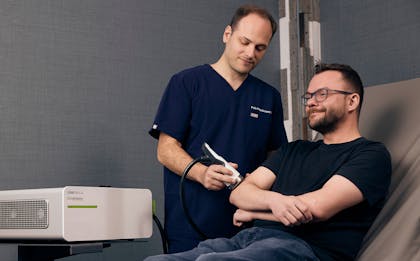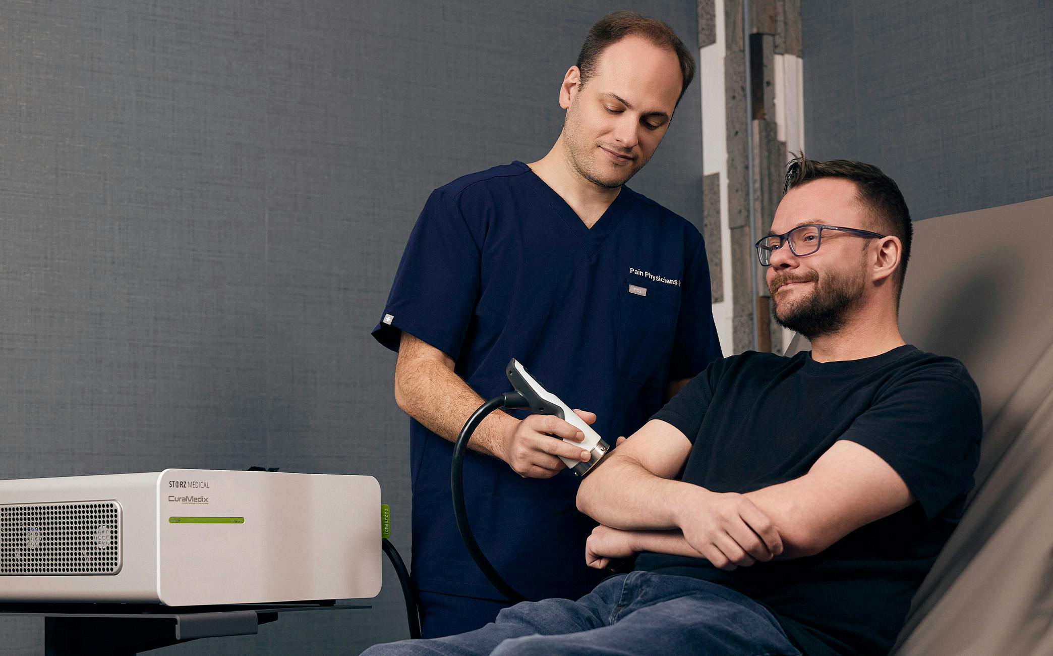 Shockwave therapy is a non-invasive treatment that delivers acoustic waves into targeted tissue. These waves stimulate a biologic response that may support healing, reduce pain, and improve function.